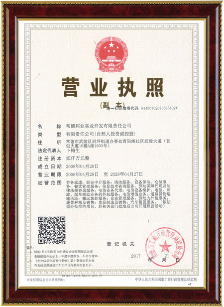 常德邦業(yè)實(shí)業(yè)開(kāi)發(fā)有限責(zé)任公司(原名常德市邦業(yè)人力資源開(kāi)發(fā)有限責(zé)任公司)是經(jīng)湖南省人力資源和社會(huì)保障廳核準(zhǔn)備案,常德市人力資源和社會(huì)保障局批準(zhǔn),常德市工商行政管理局登記注冊(cè)的一家綜合性人力資源服務(wù)型企業(yè)。公司成立于2008年4月28日,注冊(cè)資本2000萬(wàn)元。